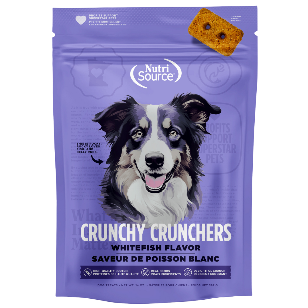 - Les croquants au poisson blanc NutriSource sont fabriqués avec des protéines de haute qualité.