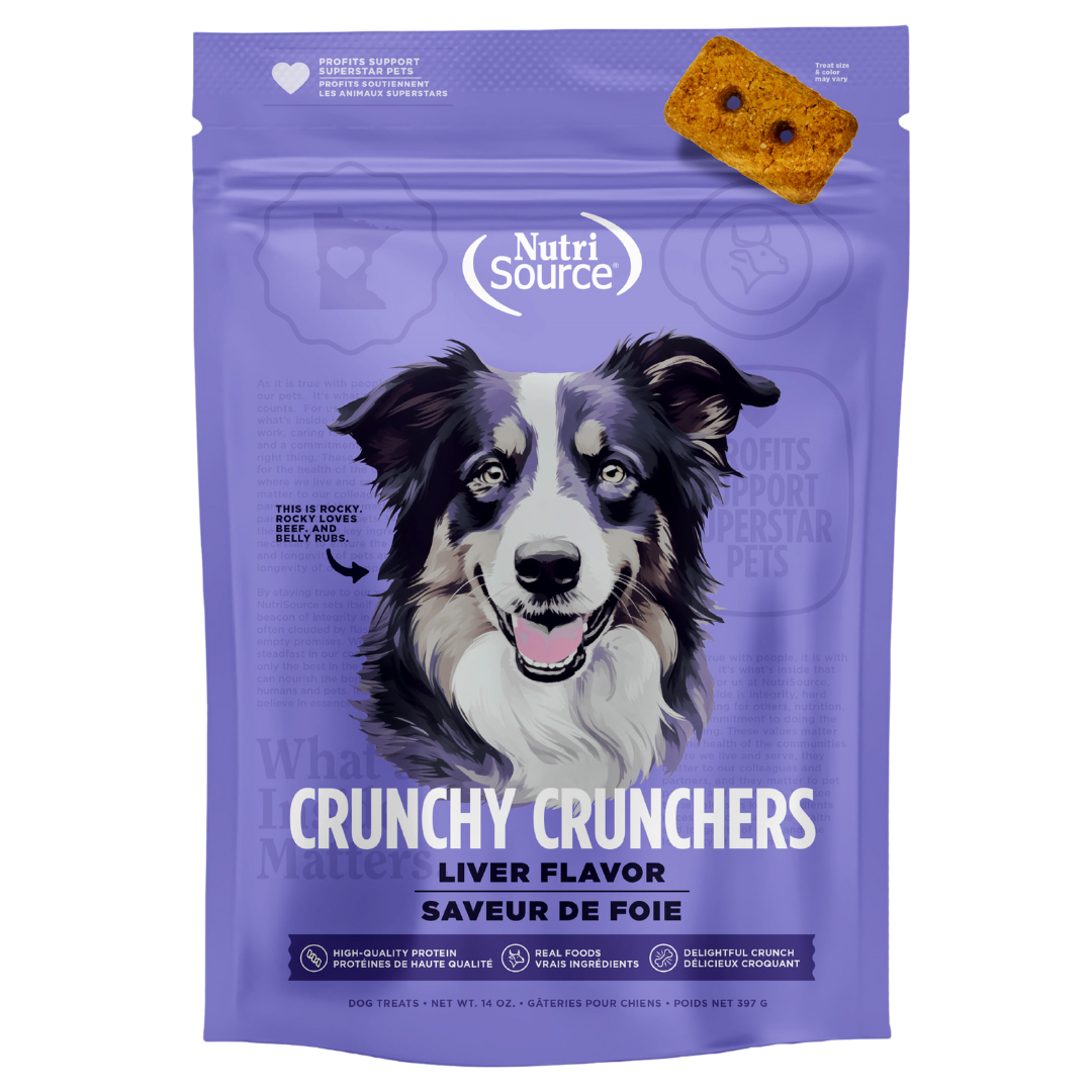 - Les croquants croustillants au foie NutriSource sont fabriqués avec des protéines de haute qualité.